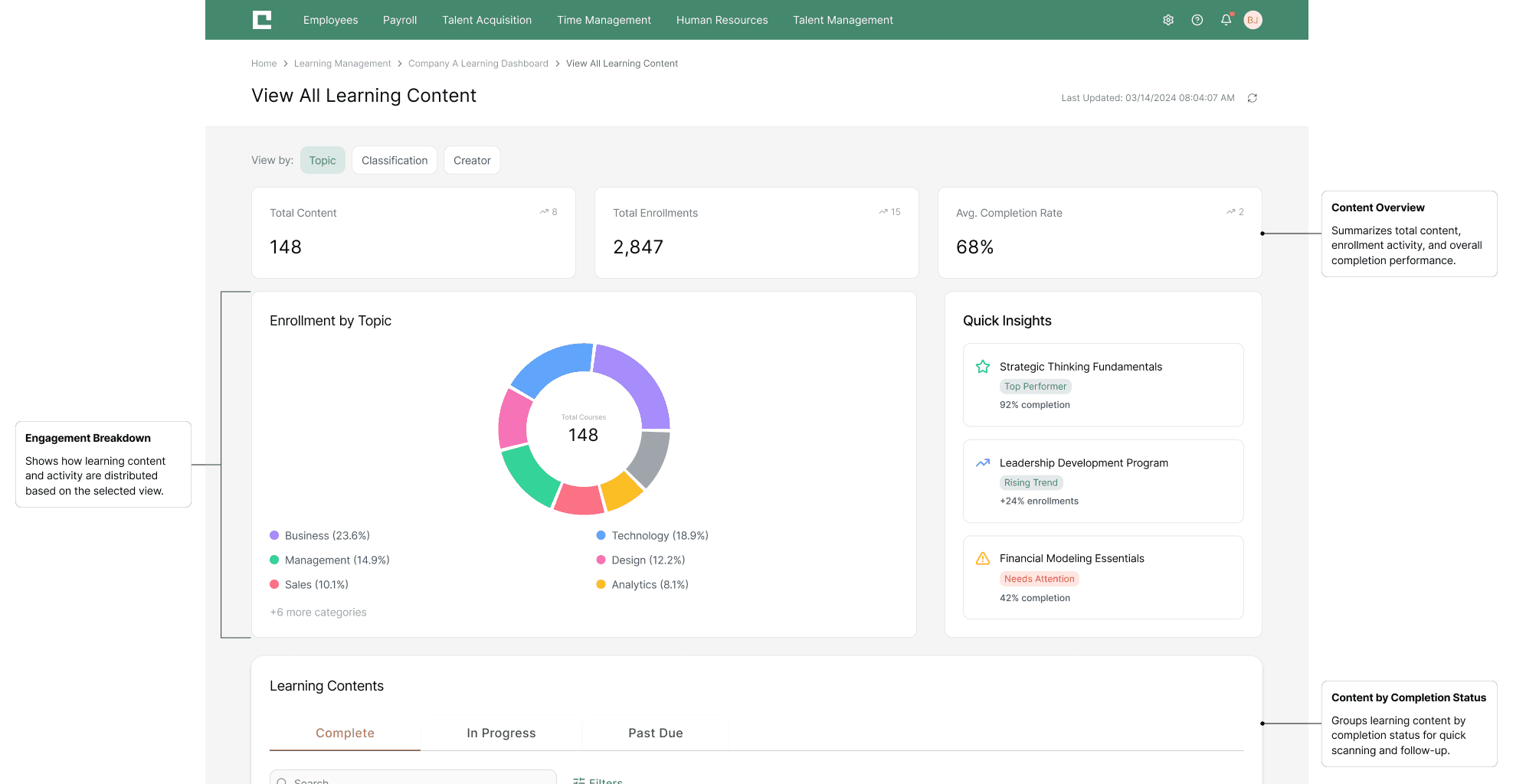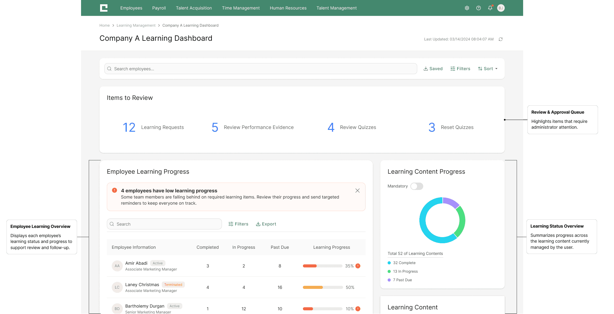 Building on the need to consolidate four separate dashboards into a unified experience, I designed targeted solutions that bring all learning-related information into a single, intuitive interface—while preserving the unique functionality of each original dashboard. This approach resulted in three core features that fundamentally change how administrators access and act on learning data: