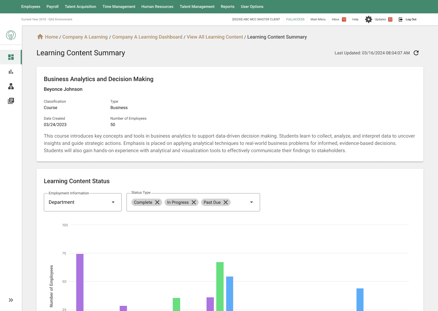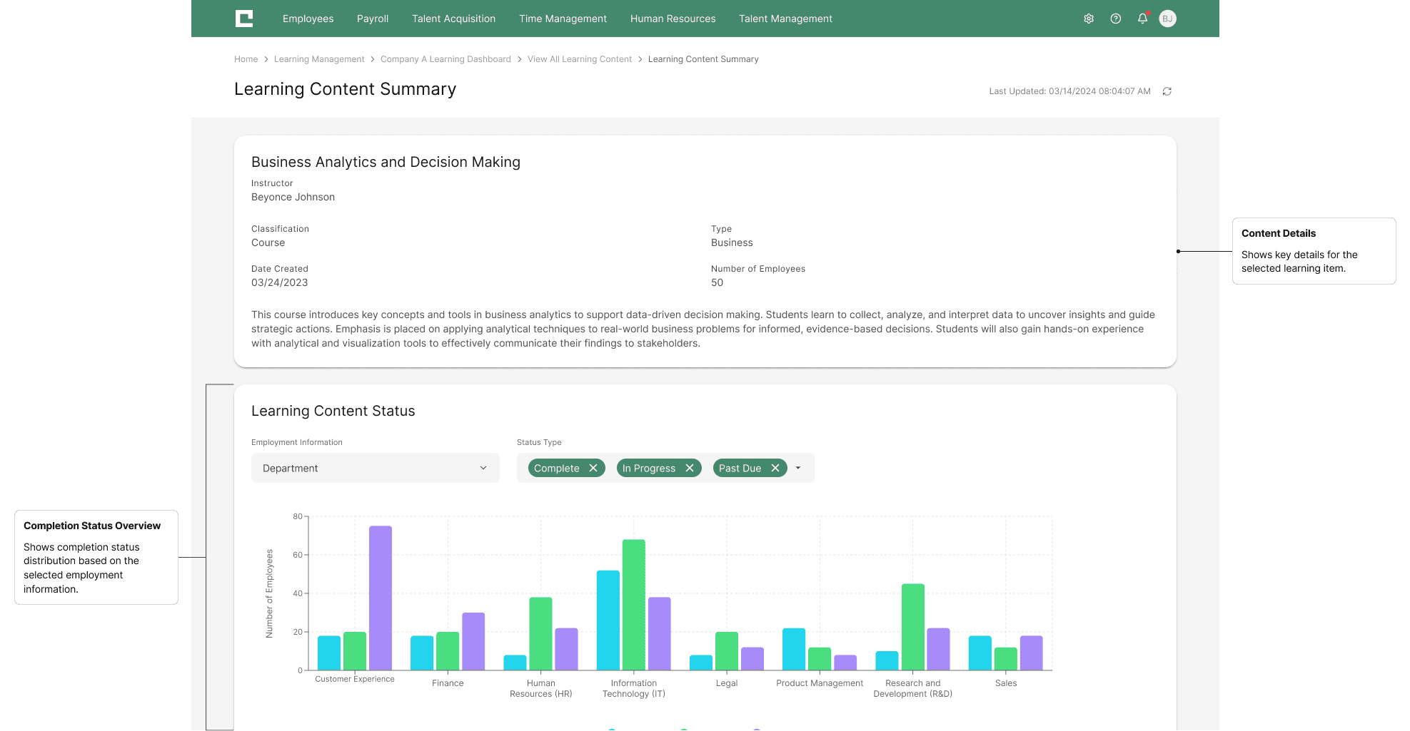 Instantly track the progress of a single training module across an entire team. Clear data visualizations highlight completion status and help supervisors track compliance and identify bottlenecks at a glance.