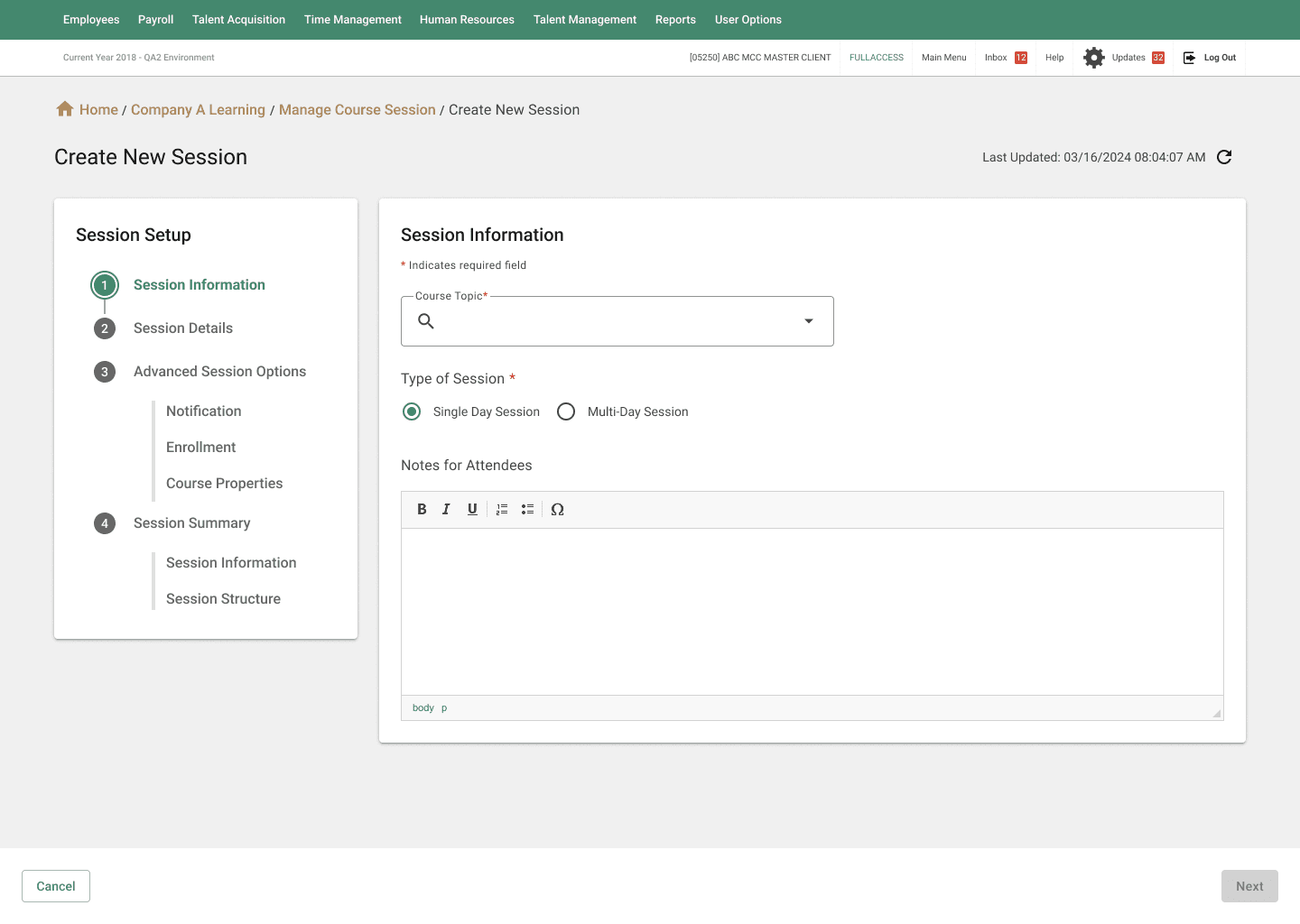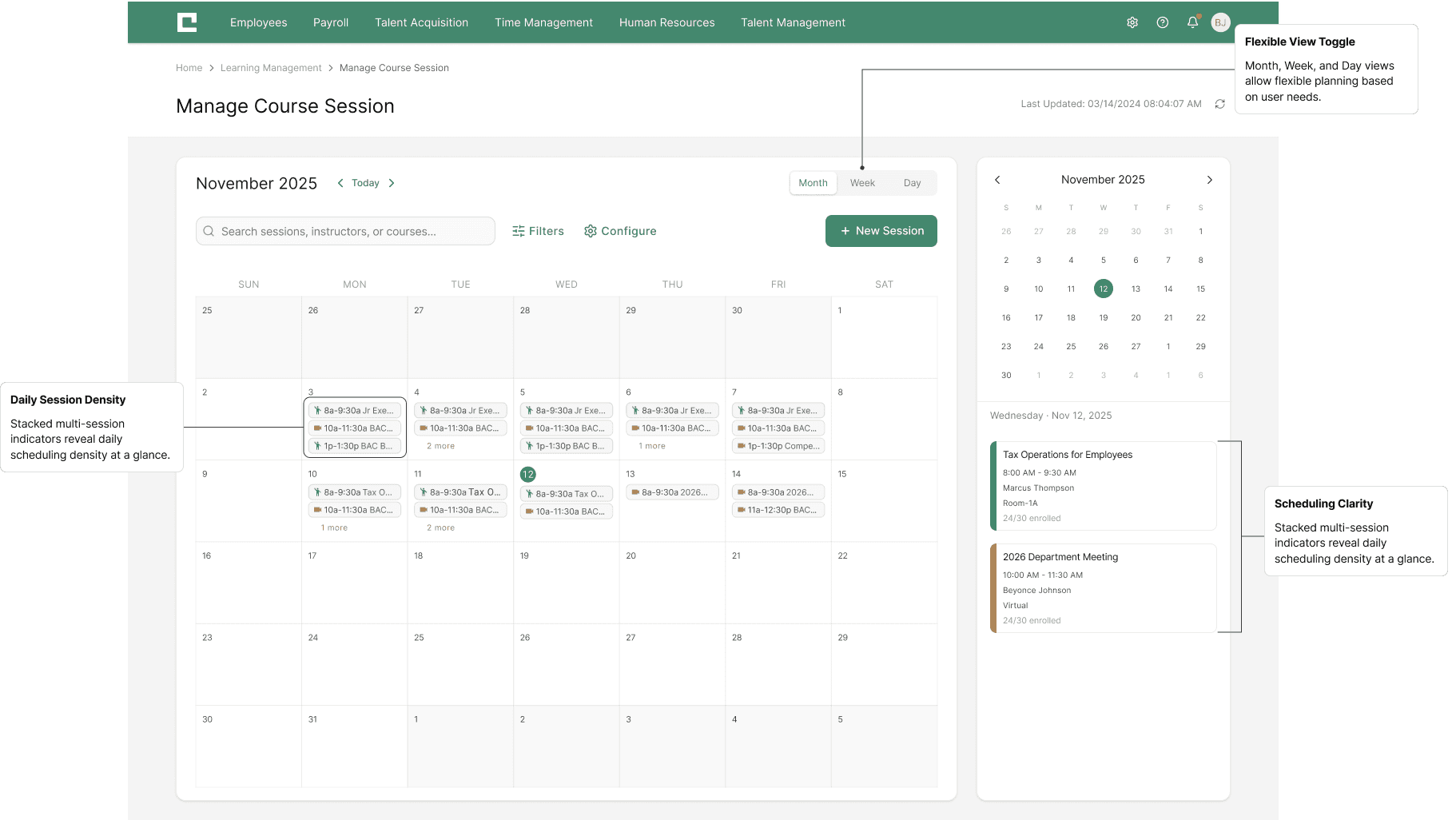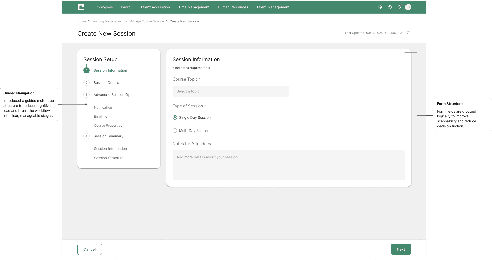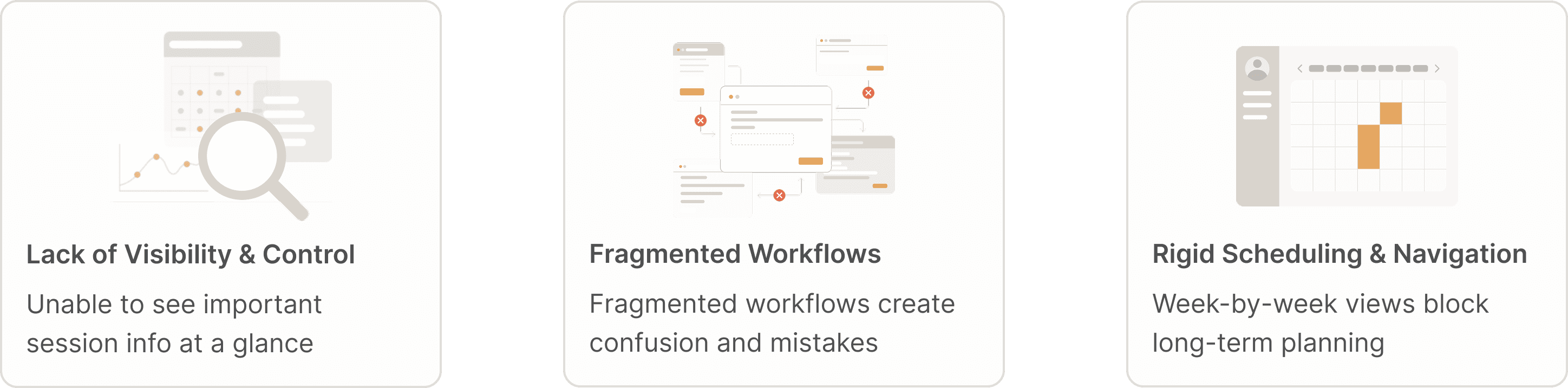 Paycom’s enterprise clients operated training programs at a scale and complexity the original Manage Course Session system wasn’t designed for. As session volume, variability, and operational demands increased, workflows that once supported smaller sessions began breaking down. Administrators needed more clarity, flexibility, and predictability to confidently manage multi-day training programs. These limitations made a redesign essential to modernize the scheduling model and support enterprise-level operations.