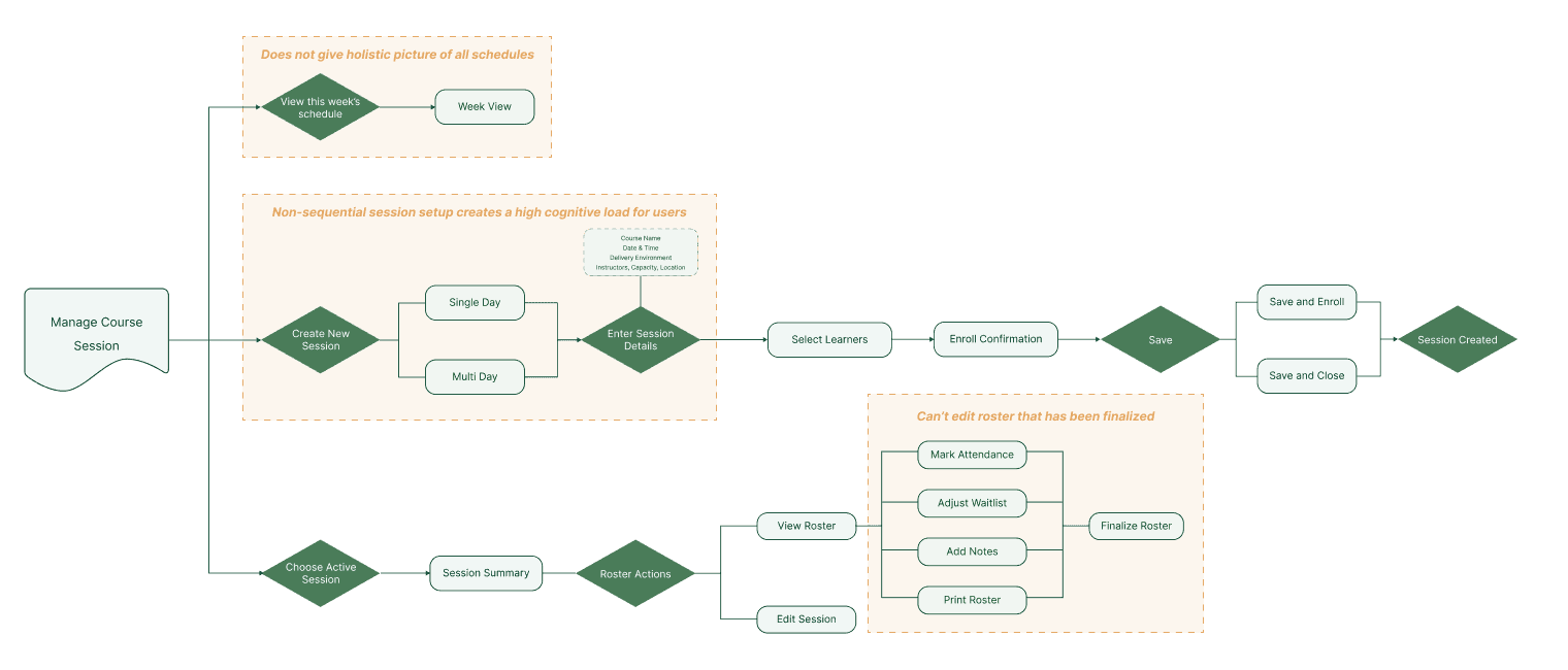 Manage Course Session is a session-management system designed for large-scale training programs. The previous experience made scheduling unpredictable and difficult to maintain at scale, creating friction for administrators who needed clearer visibility and greater flexibility.