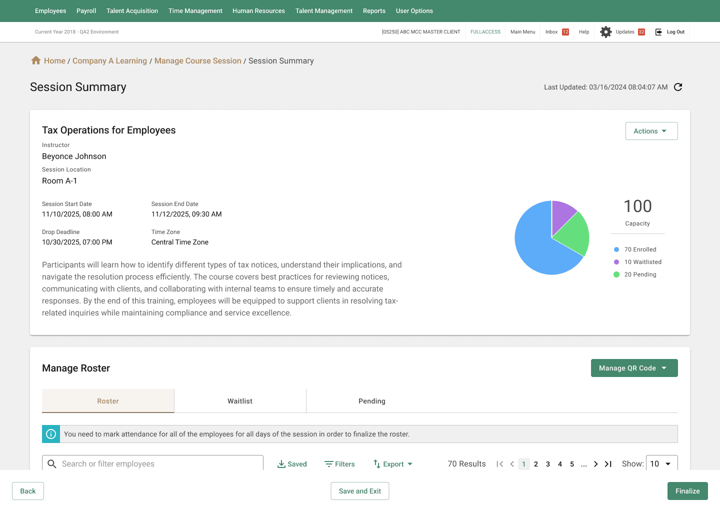 A flexible roster interface that enables trainers to take attendance, adjust participant details, and revise finalized rosters when needed — maintaining accuracy and control over every session record.