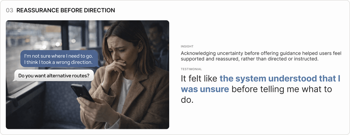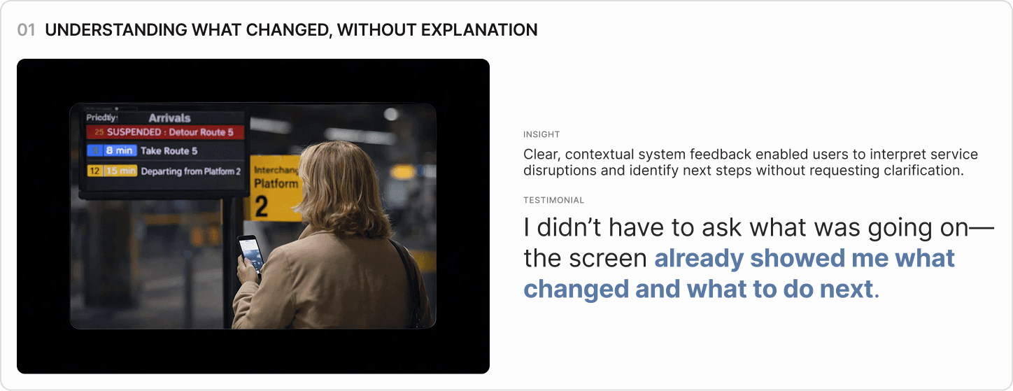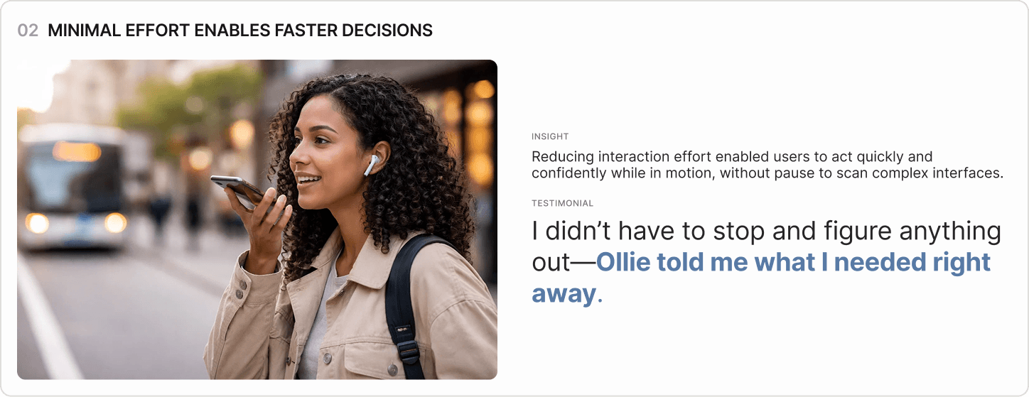 Scenario-based testing revealed consistent patterns in how participants interpreted system feedback, navigated disruptions, and sought reassurance while in transit. Rather than relying on static information or step-by-step instructions, users gravitated toward experiences that helped them quickly understand what changed, required minimal interaction while moving, and acknowledged uncertainty before offering guidance. These patterns informed how clarity, effort, and emotional support were prioritized in Ollie’s interaction design.