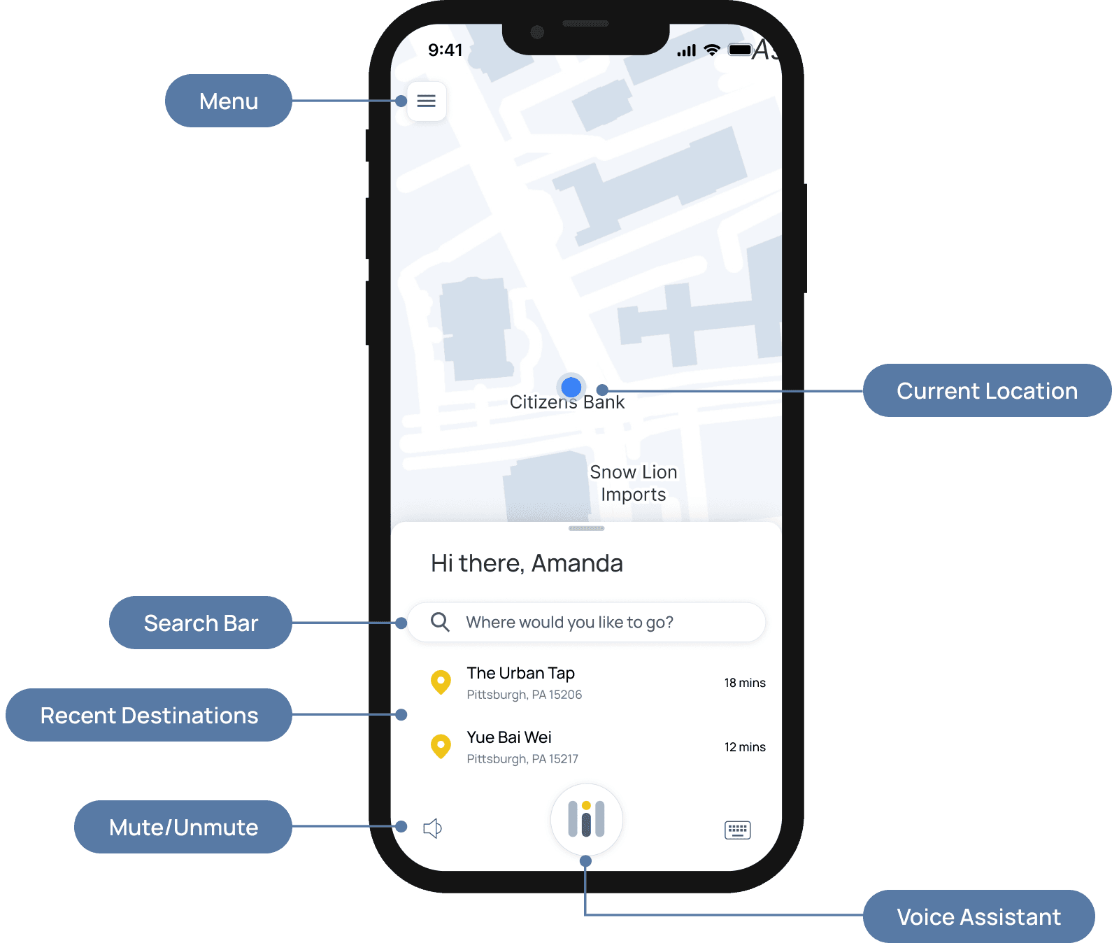Mobile devices are the primary way to use Ollie. The mobile experience combines map-based navigation with conversational interaction to help passengers get assistance without losing focus. Passengers can ask questions, receive updates, and understand next steps through voice or text—allowing support to adapt to different travel contexts and levels of urgency.