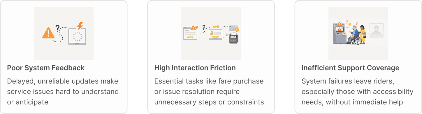The system was built for small networks, not citywide scale. As a result, critical information is scattered across disjointed channels, forcing passengers to hunt, backtrack, and piece together updates that should be visible at a glance.