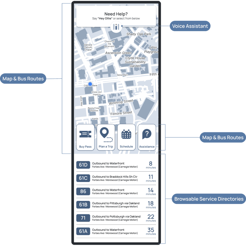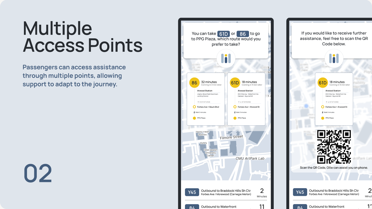 The kiosk provides on-site access for users without mobile devices. Designed for shared, public use, it prioritizes clarity and speed to minimize cognitive load, ensuring Ollie remains accessible across different physical contexts.
